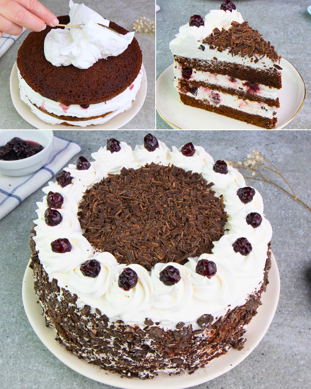INGREDIENTI Per la base: 150 g di cioccolato fondente 140 g (1/2 tazza) di burro 6 uova 160 g (3/4 tazza) di zucchero 120 g (1 tazza) di farina 8 g (1/2 cucchiaio) di lievito in polvere Per spennellare: 270 g (1 tazza) di sciroppo di ciliegia 40 g (1/4 tazza) di acqua Per il … Lire plus