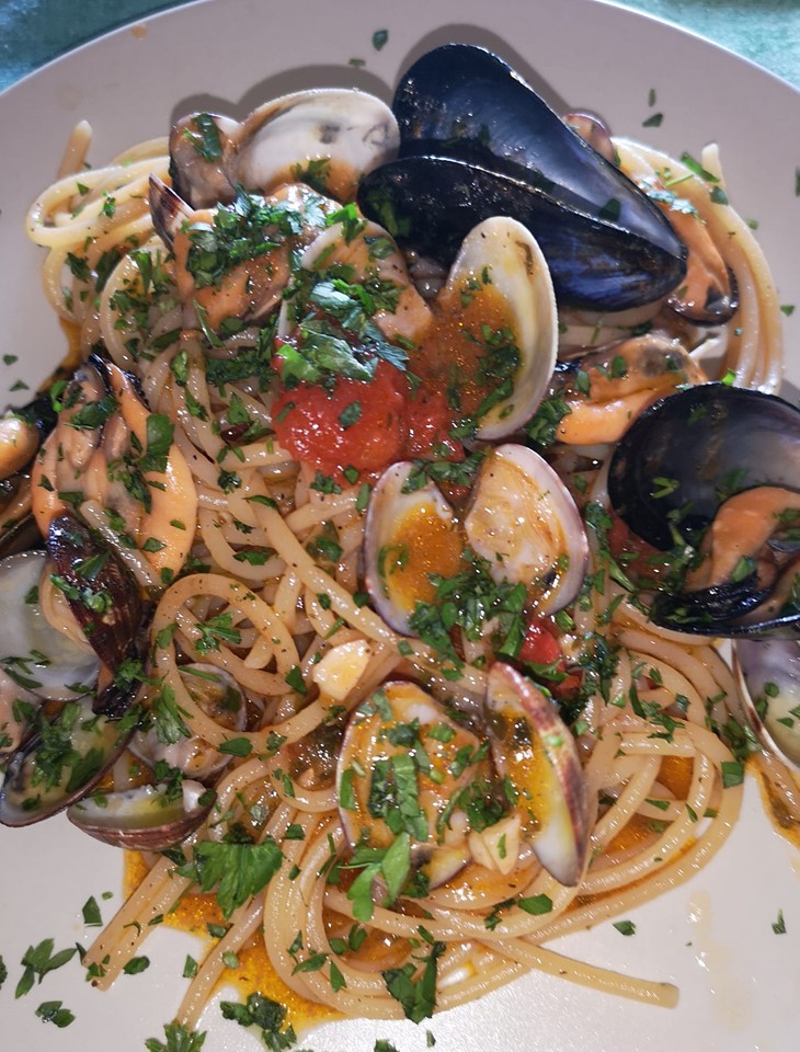 Nella stessa padella metto a rosolare un trito di aglio prezzemolo ed un po’ di peperoncino aggiungo i pomodorini ed il liquido dei frutti filtrato… Faccio andere x una 10 di minuti aggiungo lo spaghetto molto al dente e lo faccio e lo porto in cottura nel sughetto se necessario aggiungo dell ‘acqua di cottura e continuo a mantecare la pasta che rilascia il suo amido e fa una cremina aggiungo i frutti di mare sgusciati e ne tengo un po’ interi quando è pronta aggiungo un filo di olio a crudo ed una bella manciata di prezzemolo ed impiatti mettendo i frutti con il guscio x guarnizione.