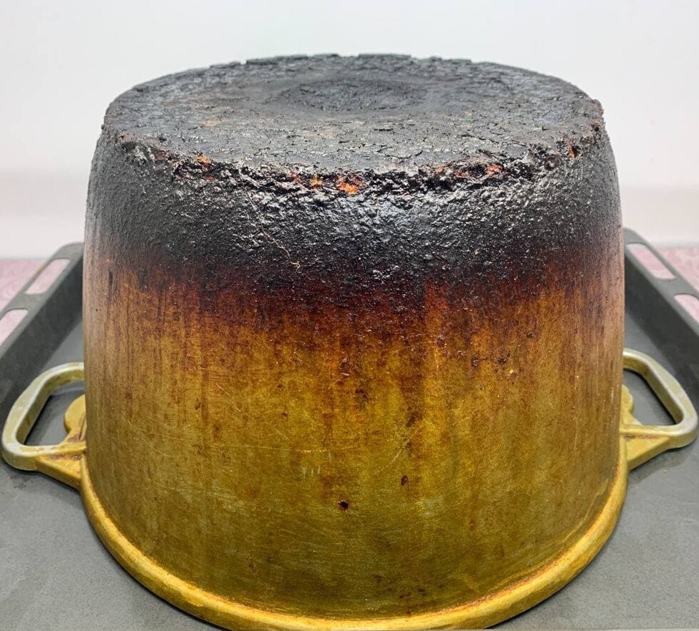 Questo è un calderone che ha fatto lunghe passeggiate più di una volta, è sopravvissuto a più di un picnic, quindi le sue pareti sono ricoperte da uno spesso rivestimento grasso e sul fondo si è formata fuliggine. Questo è ciò che cercheremo di rendere nuovo e brillante, e alla fine dell’esperimento scopriremo qual è l’ingrediente segreto che porta a questo risultato.